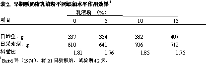 除了幾個研究(Becker等,1957;Danielson等,1960)以外,幾十年以前,只有少數(shù)研究者對乳清粉進行過研究。在20世紀70年代早期,我們在肯塔基大學曾開展試驗評價過3周齡斷奶仔豬飼料中乳清粉的效果。在其中一個試驗中,我們在早期斷奶仔豬的玉米-豆粕型基礎日糧中添加3個水平(5%、10%和15%)的乳清粉,結(jié)果發(fā)現(xiàn),隨著乳清粉添加量的提高,豬的生長速度和采食量呈線型增加(Baird等,1974;表2)。在這些研究中,我們還發(fā)現(xiàn)添加源自乳清粉的相同水平的乳糖時,豬的生長速度和采食量與飼喂乳清粉的效果類似。