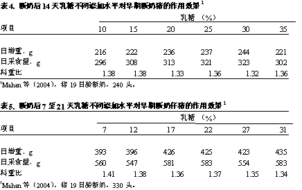 人們關心的是,仔豬保育期的各個階段乳糖的添加量問題。Mahan等(2004)最近對此進行研究發(fā)現(xiàn),在斷奶后最初的14天(表4)和在斷奶后7至21天(表5),豬對高水平的乳糖均能產(chǎn)生應答。他們推薦在豬斷奶后的1周(7