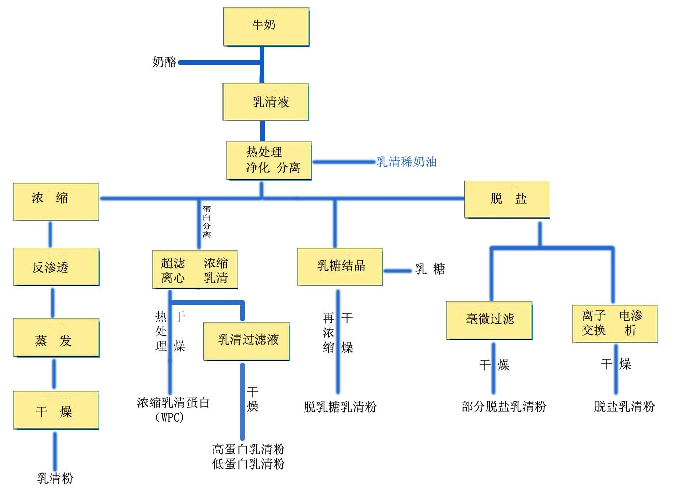 乳清分離蛋白特指蛋白質(zhì)含量不低于90%的乳清蛋白制品。要求在WPC的基礎(chǔ)上去除非蛋白組分更充分 ,通常需要離子交換技術(shù)與超濾技術(shù)相結(jié)合或超濾與微濾相結(jié)合制得